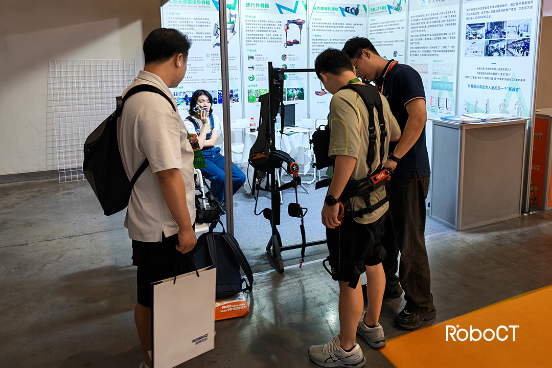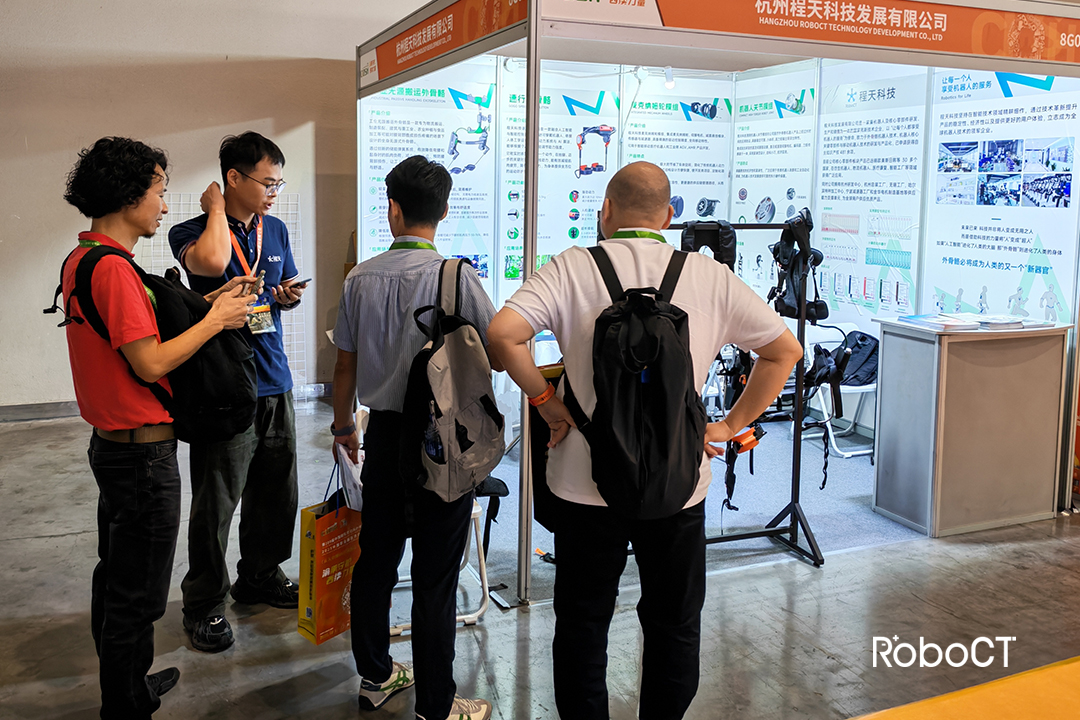 程天科技的工業搬運外骨骼產品,針對傳統倉儲物流、快遞分揀、公安消防等場景中,高強度、重復性的搬運作業導致從業人員腰部損傷、肌肉疲勞等問題設計,通過人體工學設計與自適應力反饋系統,在使用者彎腰、起身、托舉的瞬間提供助力,將作用在人體腰部的受力負荷大幅轉移至機械結構,實現最高超過23公斤的有效減負。在程天科技的展臺現場,參觀者近距離觀摩甚至親身體驗外骨骼設備。