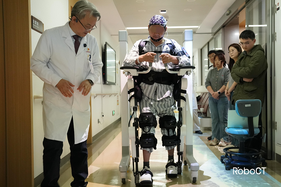 而現在,在同濟醫院程黎明教授團隊的指導下,葉先生頭戴無創腦電接口設備,穿戴程天科技的康復外骨骼機器人。當他想“邁出左腳”的意念產生時,腦電信號瞬間被捕捉、放大、解碼,轉化為指令傳遞至外骨骼機器人。與此同時,植入體內的脊髓電刺激芯片精準激活下肢神經,與外骨骼協同發力,幫助他完成了屈伸、邁步、承重等一系列復雜動作。